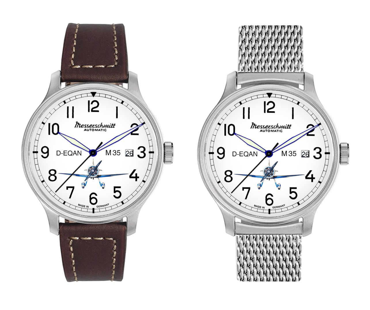 Edelstahl satiniert, Ø 42 mm, Mineralglas, 5 atm, mit Schweizer Automatic-Werk Sellita SW 200-1 oder mit Schweizer Ronda Quarz-Werk 515, Zifferblatt schwarz oder versilbert mit der M35 digital aufgedruckt.